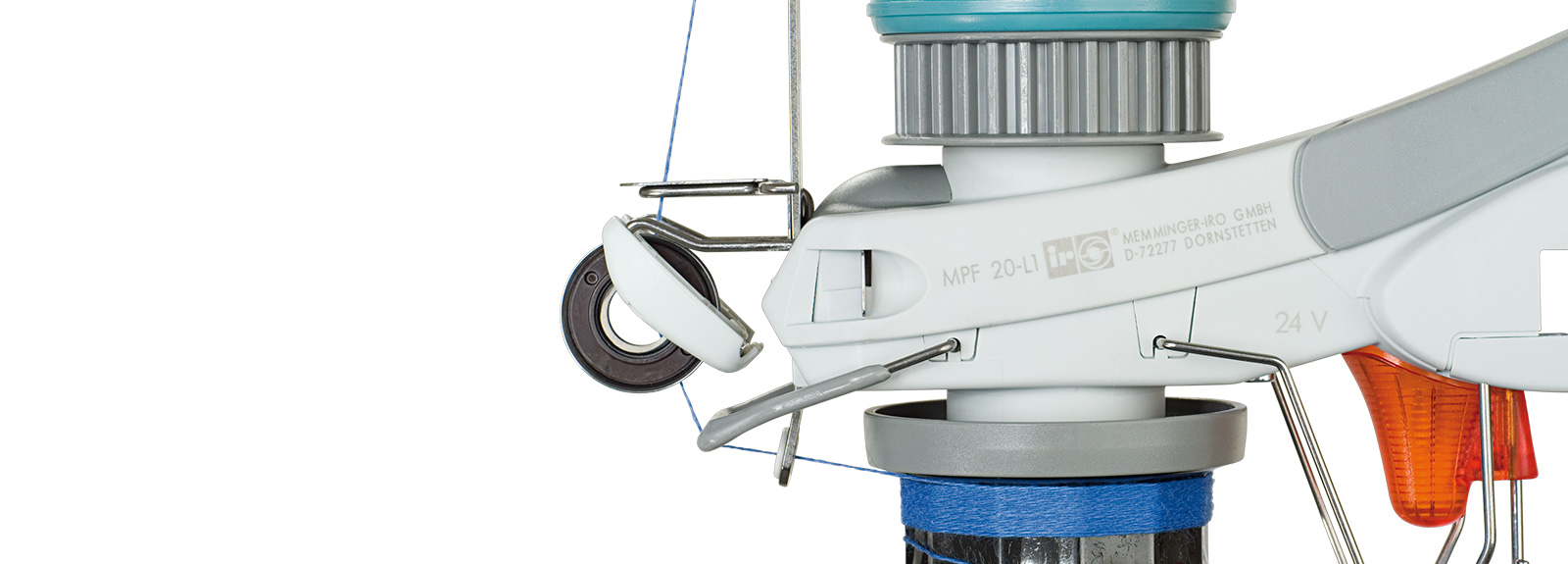 MPF L - 積極式儲紗送紗器的入紗張力裝置有自潔作用的磁性張力碟和一體成型的抗磨損儲紗送紗輪為其特色。 其他特點包含內置防殘絲裝置和出紗張力可低到1 cN(厘牛頓)的出紗結構。